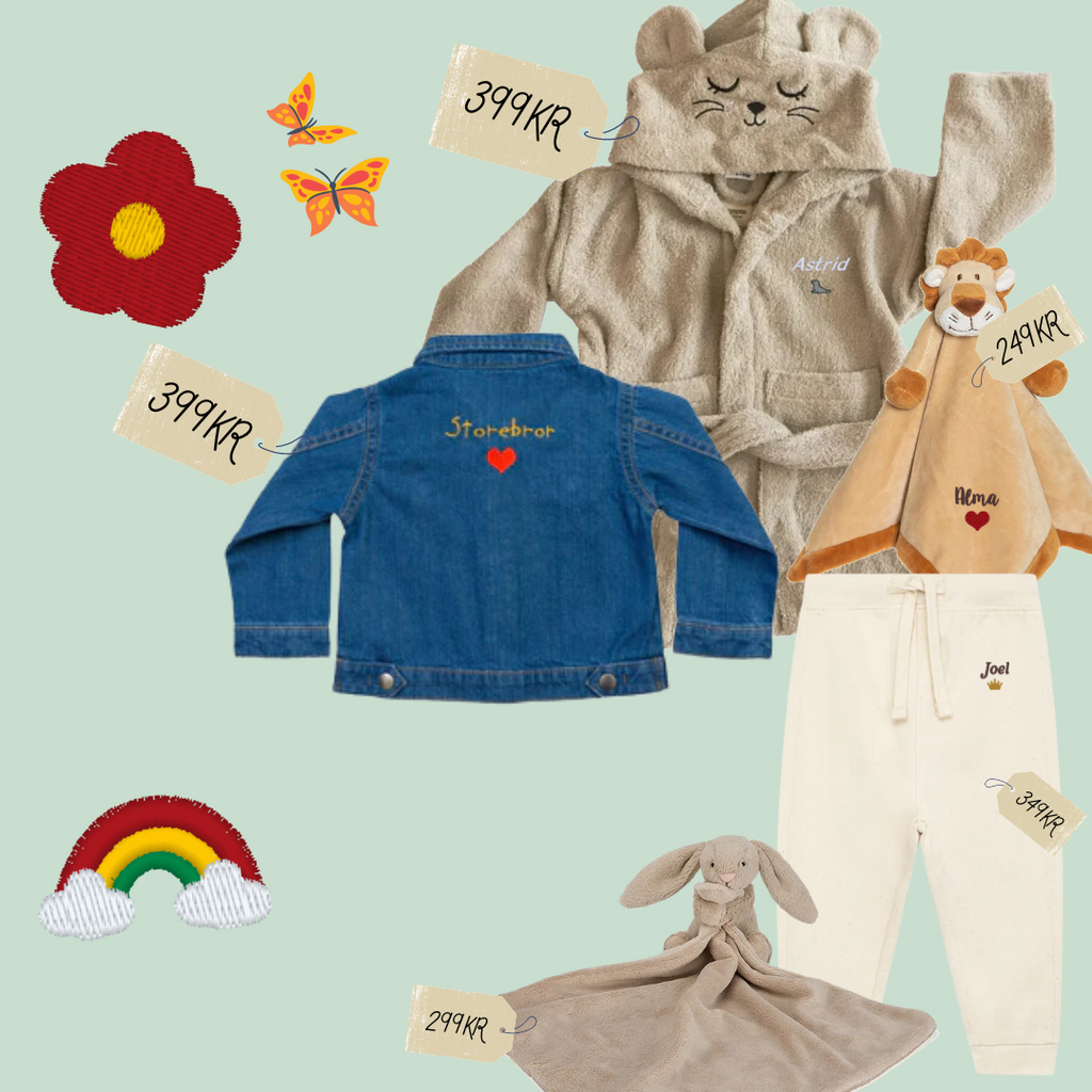 Många av våra produkter går att göra personliga via val av egen text, typsnitt, trådfärg och ikon.